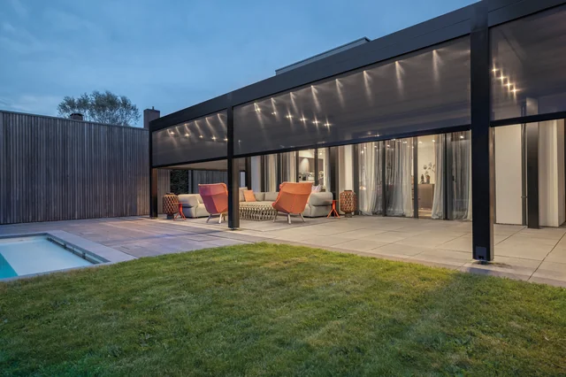 I sistemi di chiusura laterale integrati in tessuto screen garantiscono privacy, protezione dal vento e comfort in ogni stagione.