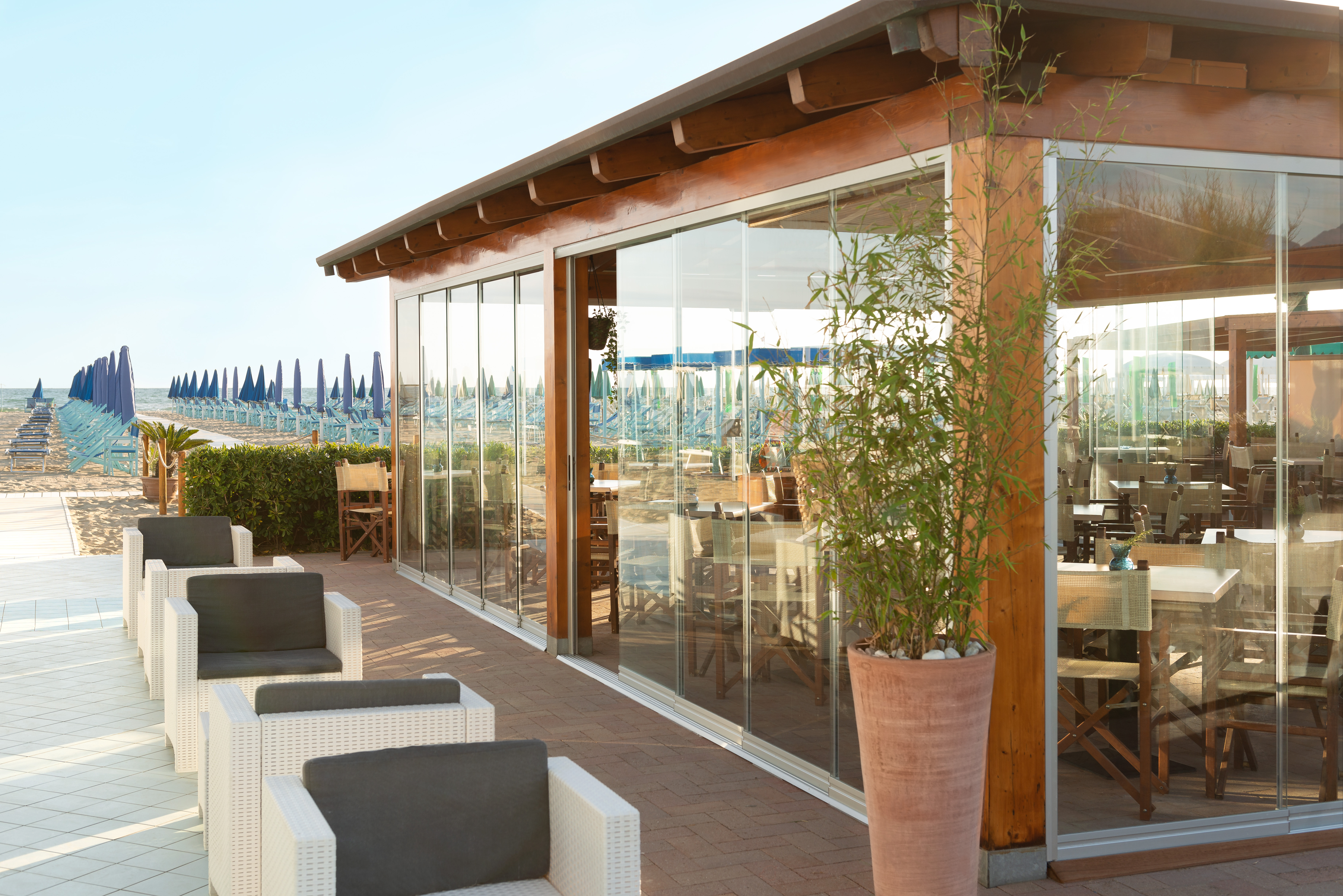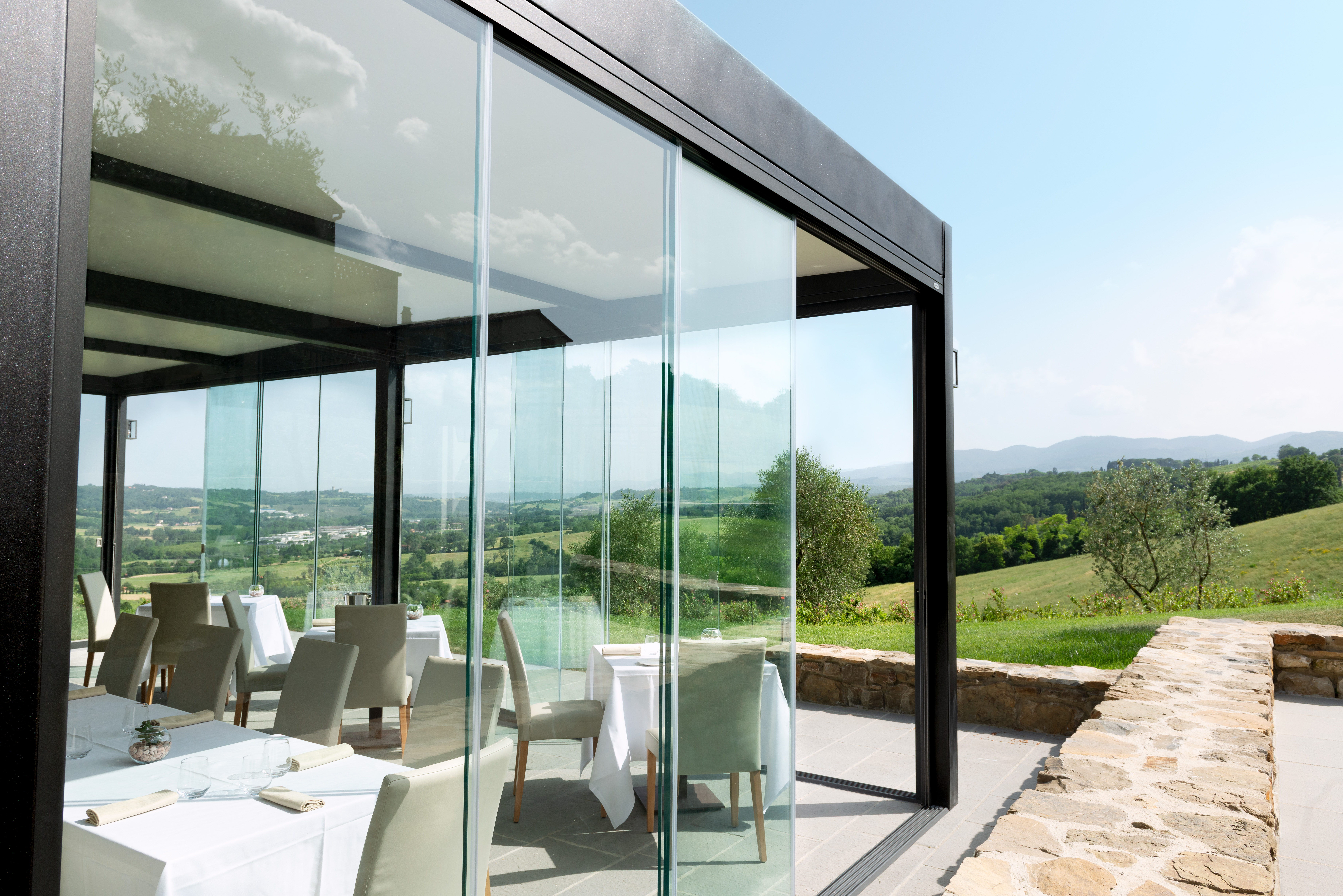 Il suo sistema impacchettabile di ultima generazione consente un’apertura totale verso l’esterno, cancellando ogni barriera tra interno ed esterno.